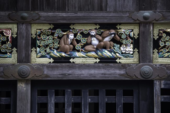 Nikko’s World Heritage shrines and temples are a 10 minute bus ride (310 yen one way, 500 yen day pass, covered by optional Nikko passes) from the Tobu and JR Nikko Stations. The Toshogu shrine contains the remains of Tokugawa Ieyasu, the founder and first shogun of the Tokugawa shogunate of Japan (1603-1867). Toshogu’s most famous carving is of the three wise monkeys, Mizaru, covering his eyes, who sees no evil; Kikazaru, covering his ears, hears no evil; and Iwazaru, who by covering his mouth, speaks no evil.
